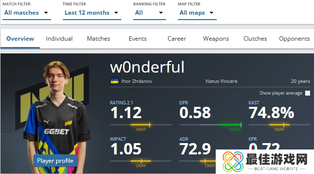 个人数据方面,w0nderful在过去一年中打出1.12 rating的表现。