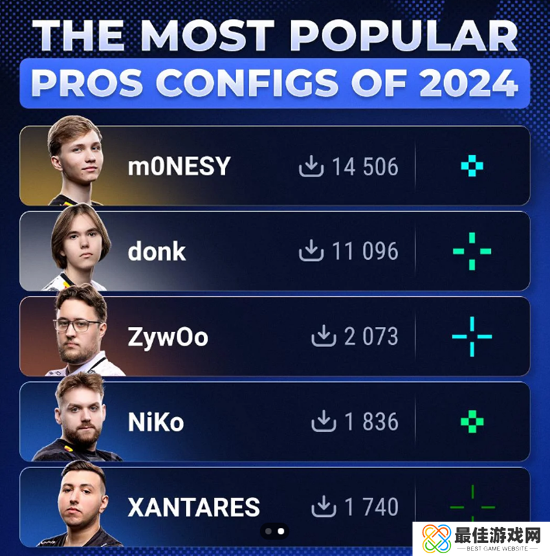 从数据看,m0NESY的config在今年最受欢迎,超过第二名donk 3410份。而ZywOo、NiKo、XANTARES虽然也进入了Top5榜单,但他们的config下载量和前两人相差甚远。