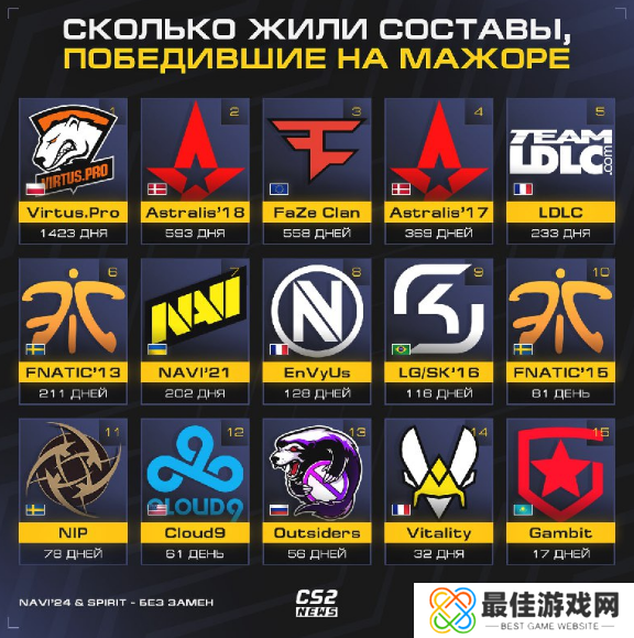 VP战队是Major夺冠队伍中维持阵容最长久的,他们在拿到2014 EMS 卡托维兹Major之后,直到1423天后才进行了第二次变阵。