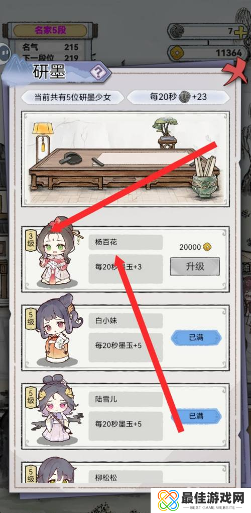 2、在“研墨”界面,你可以看到所有可用的研墨角色列表,寻找到杨百花后,对准她旁边的“升级”按键进行点击。