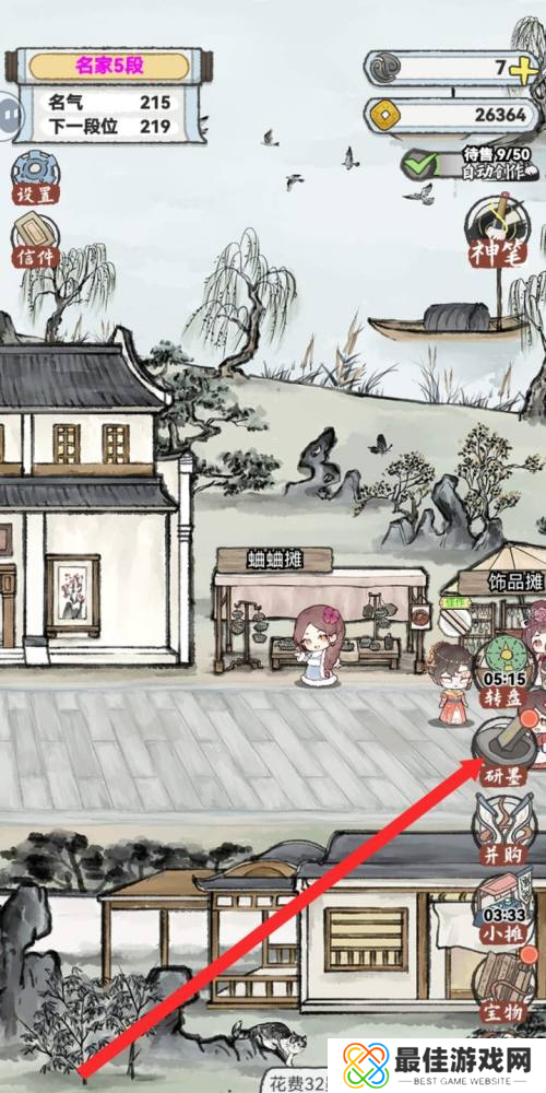 1、首先,我们要抵达游戏的主菜单,然后在界面右侧点击“研墨”选项以进入。