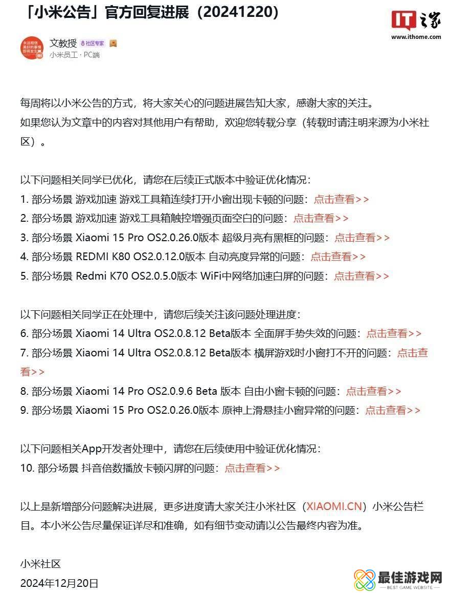 在此次公告中,小米指出,针对部分用户反馈的在使用游戏加速功能时,游戏工具箱连续打开小窗会出现卡顿的现象,以及触控增强页面偶尔显示空白的问题,团队已经进行了优化处理。对于小米15 Pro在OS2.0.26.0版本下拍摄超级月亮时出现黑框的问题,以及Redmi K80在OS2.0.12.0版本中自动亮度调节异常的情况,均得到了有效解决。