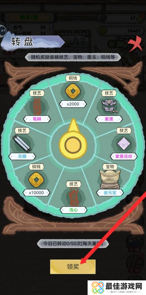 2、在抽奖盘的奖励界面,点击底部领取奖励按钮,即可有机会得到随机分配的金元宝。
