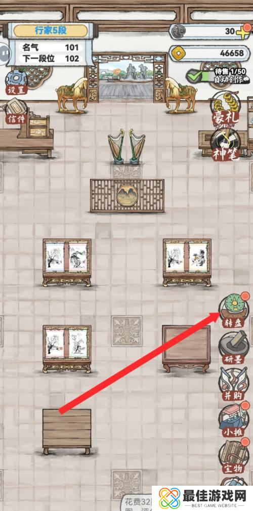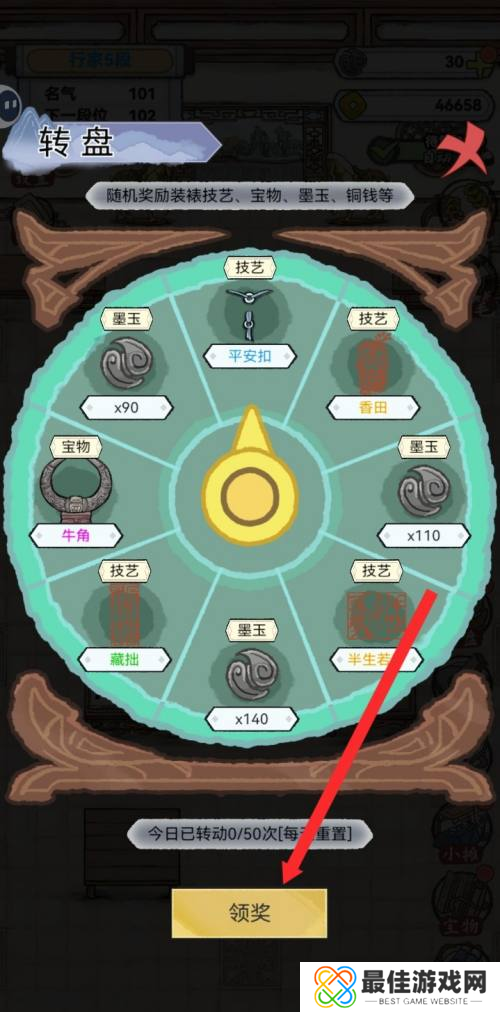 2、进入转盘抽奖区域后,请点击页面底部的“领取”按钮。每天最多可以领取50次,有机会随机得到装裱技能。