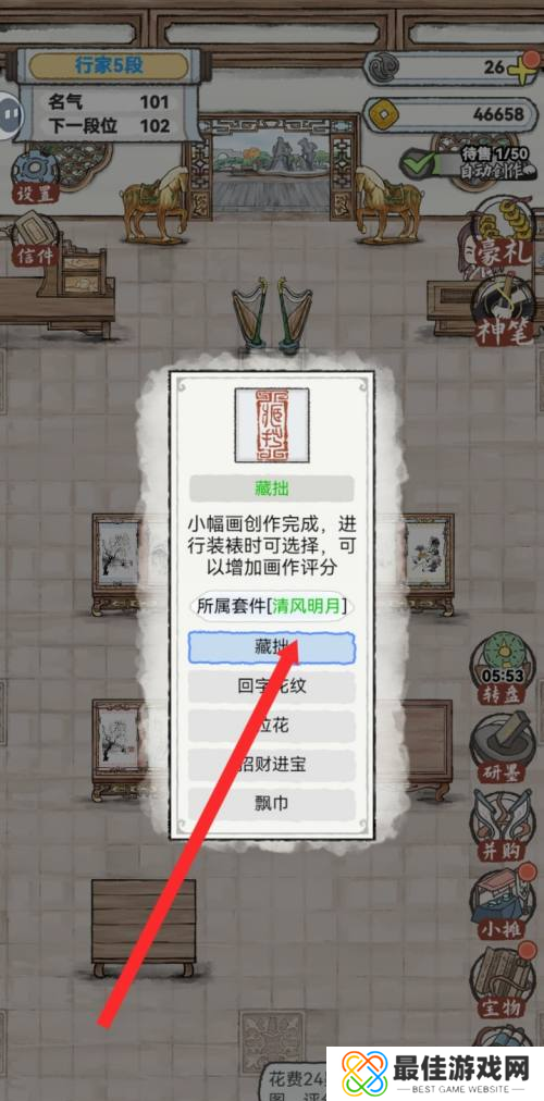 3、当转得装裱技能时,选择“藏拙”选项,并确认领取。此技能适用于装裱小尺寸画作,能有效提升作品的评分。