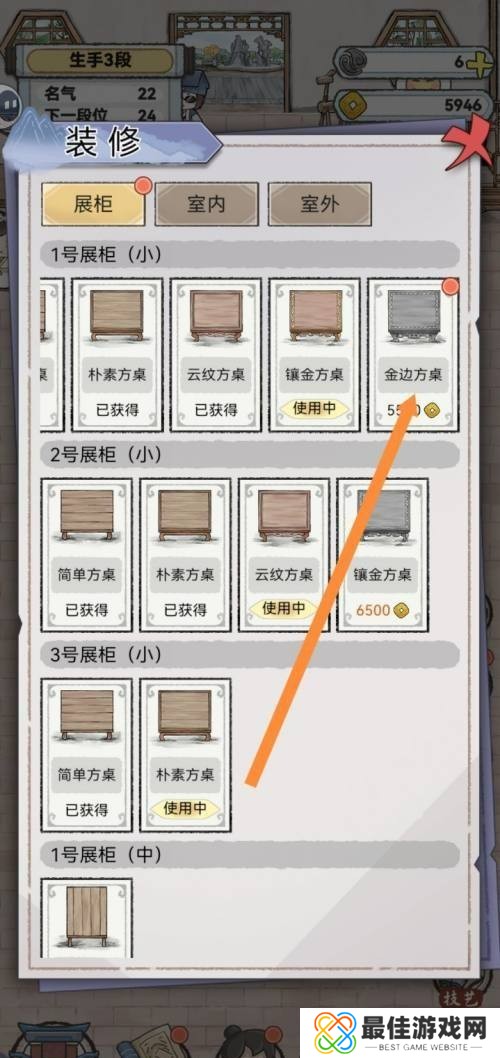 2、成功进入装修区域后,请在页面的底部找到并点击“展柜”一栏,随后在编号1的展柜中,您将能够发现带有金边的方形桌面。
