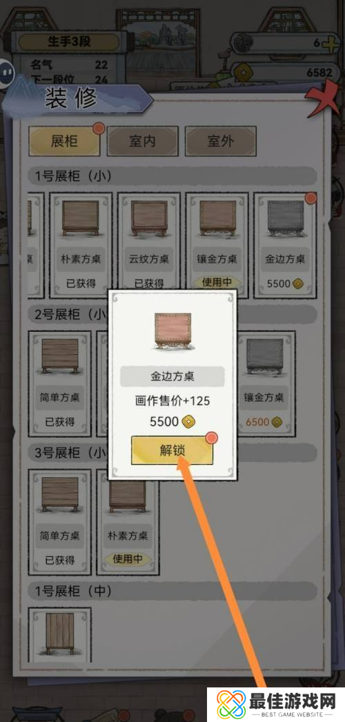 3、接着,对金边方桌进行点击以查看详细信息,按下“解锁”按钮,并支付5500枚金币以取得该物品。一旦拥有,该物品会使您的画作销售价格增加125金币。