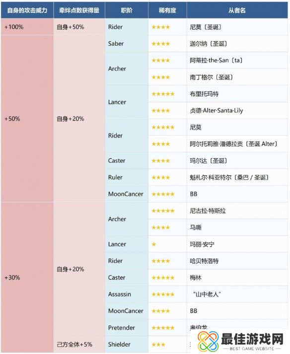 本期活动中,活动从者仅提供攻击力与羁绊加成,如下所示。
