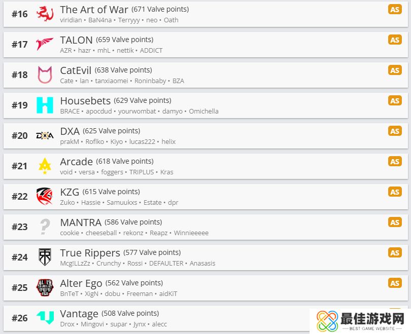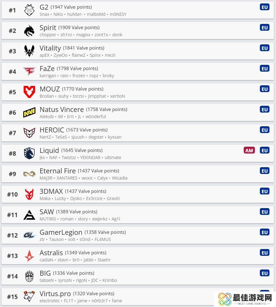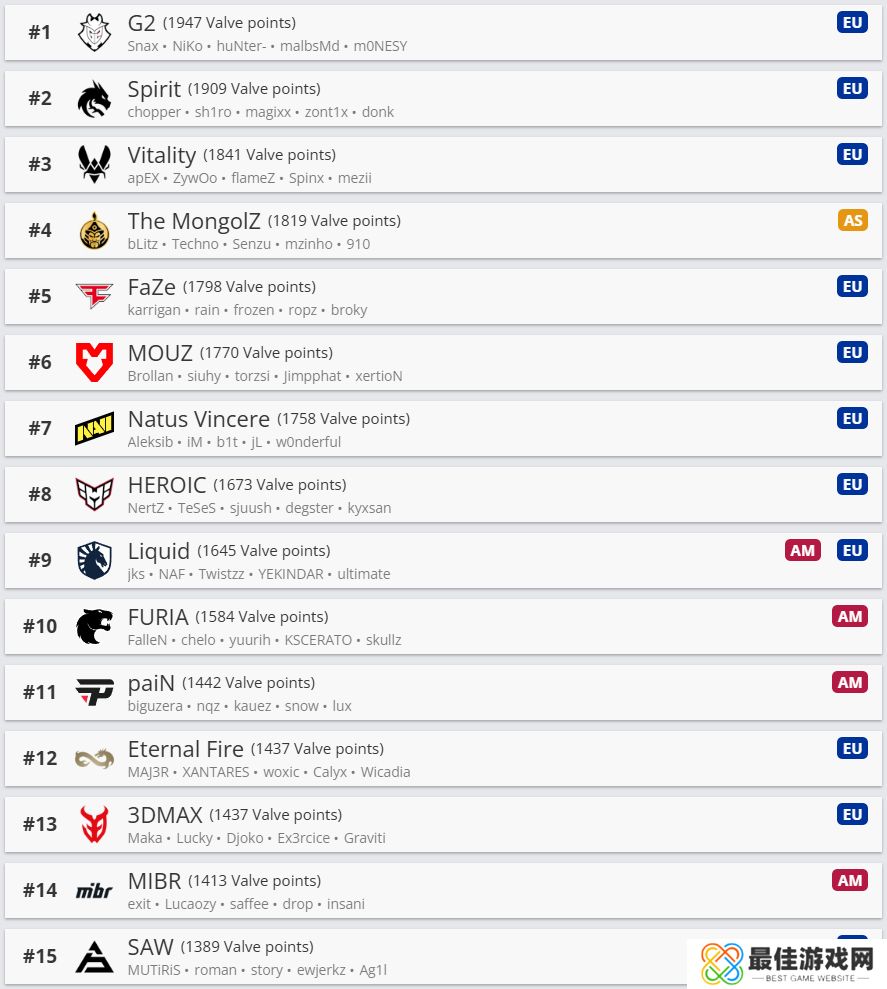 一起看看最新一期的V社世界排名吧。今天V社更新了旗下CS世界排名,这一世界排名会和明年的赛事邀请紧密联系,因此是主办方和战队都必须关注的内容。前十名没有发生任何变化。G2仍然稳坐头把交椅,紧随其后的是