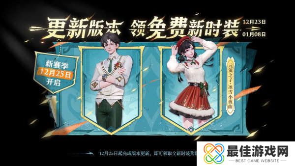 在新赛季元流之子这个英雄也有好消息,这个英雄将会在新赛季更新之后陆续推出好几套全新的装扮。如下图所示,25号更新之后,玩家就可以领取一套冰雪小夜曲装扮,如下图所示。