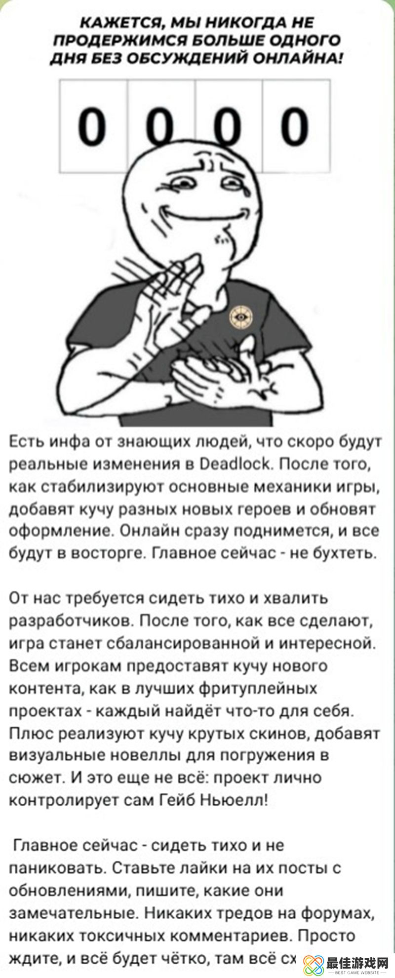 有知情人士透露,Deadlock很快将会有实质性的变化。在稳定游戏的主要机制之后,会添加大量不同的新英雄并更新游戏外观。在线人数会立刻增加,所有人都会为之兴奋不已。现在最主要的是不要抱怨。