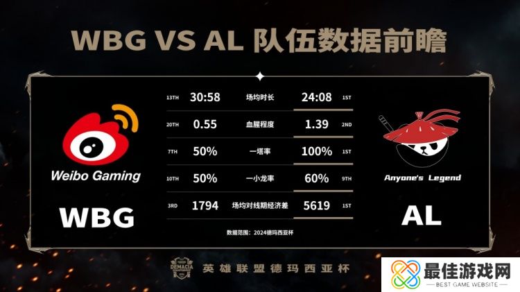 直播吧12月26日讯 英雄联盟赛事数据官博更新,发布2024德玛西亚杯半决赛-WBG vs AL数据前瞻。2024德玛西亚杯来到四强对决,AL在本次德杯中以凌厉的攻势掌控着前期比赛的节奏,他们有着目前