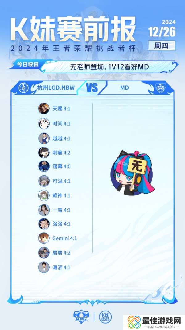 LGDNBW对战MD :无老师首战登场,1v12看好MD;
