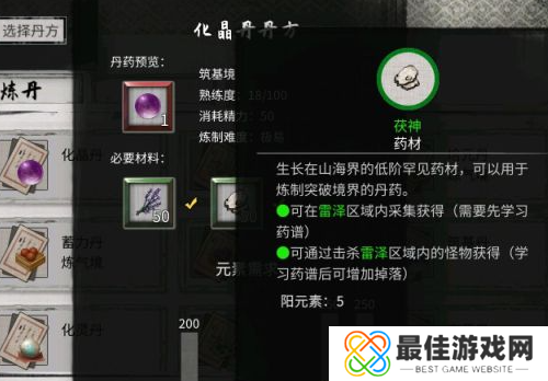 1、化晶丹:霓裳草×50、茯神×50、大蕨根茎×50。