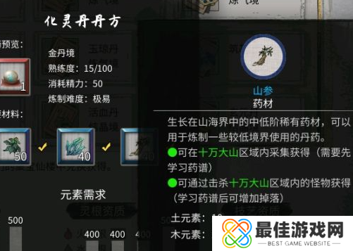 6、化灵丹:荨苎麻×50、极寒鱼尾草×40、山参×40、千叶露×50。