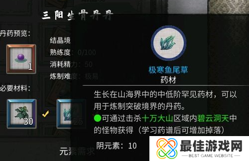 19、三阳生骨丹:荨苎麻×30、极寒鱼尾草×25、山参×20。