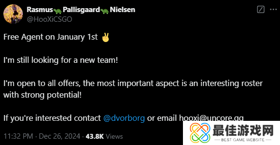 “从明年1月1日开始成为自由选手,我仍在寻找新队伍!我对所有的工作都持开放态度,最重要的是队伍的阵容有趣且潜力强大!”