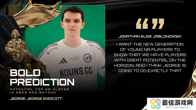 EliGE看好的是同样来自美国,目前效力于NRG的选手Jeorge。早些时间HLTV公布了2024年度最佳选手排名,鸡哥EliGE收获了TOP19的荣誉。而在明日之星环节他推荐了NRG的选手Jeorg