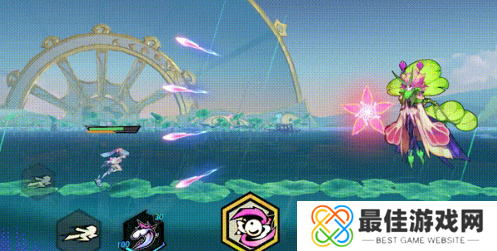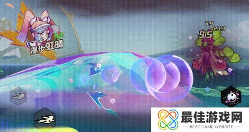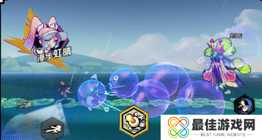 唐霜召唤幸运水浪,凝结成为超级泡泡糖,破裂后散成无数水波泡泡,命中敌人时造成水元素伤害,自身接触则回复生命值。