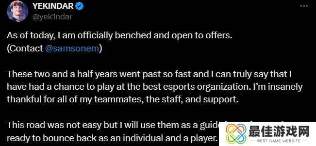 今日凌晨,YEKINDAR发文宣布被下放,开始考虑转会报价。YEKINDAR于2022年10月离开Virtus pro加入Liquid,在为战队效力两年多后,他被Liquid下放,开始考虑转会事宜。“