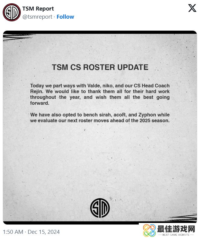 TSM正在与多个北美战队和选手讨论,计划在2025年签约一支北美CS2战队。