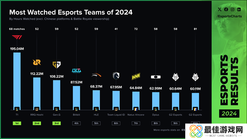2024年最受关注的电竞战队是英雄联盟S14世界总决赛冠军T1。他们在本赛季的比赛创造了超过195,000,000小时的观看时长(HW)。