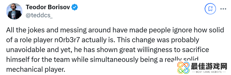 “说实话,n0rb3r7理应得到比VP更好的待遇……2023年初他们就把他下放替补席,后来他又证明了自己能重回战队,而现在问题根本不在他身上。VP这步棋真的太蠢了。 ”