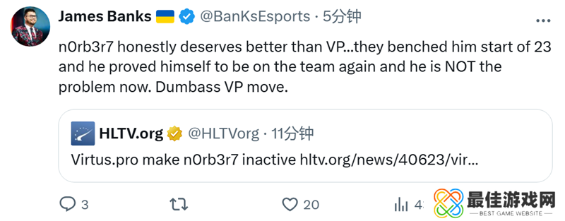 Virtus pro战队再一次将n0rb3r7下放到了替补席。对于VP的操作,目前Banks已经给出了自己的反应,他认为VP非常愚蠢。“说实话,n0rb3r7理应得到比VP更好的待遇……2023年初他