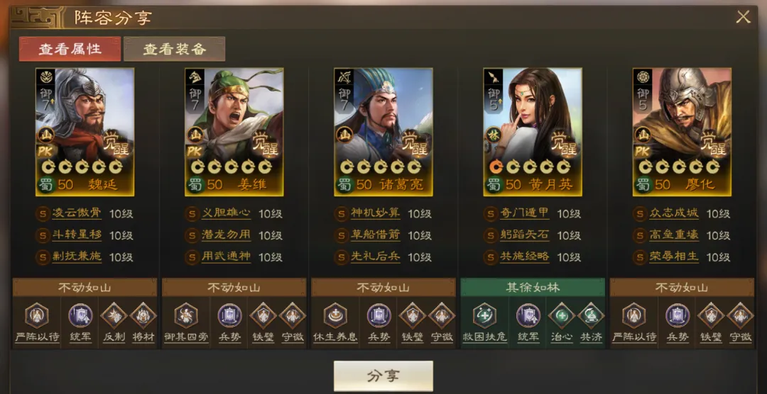另外再结合诸葛亮【八卦阵】和【先礼后兵】的控制效果以及【草船借箭】和【共施经略】的恢复效果,让本套阵容在攻防两端都得到平衡。