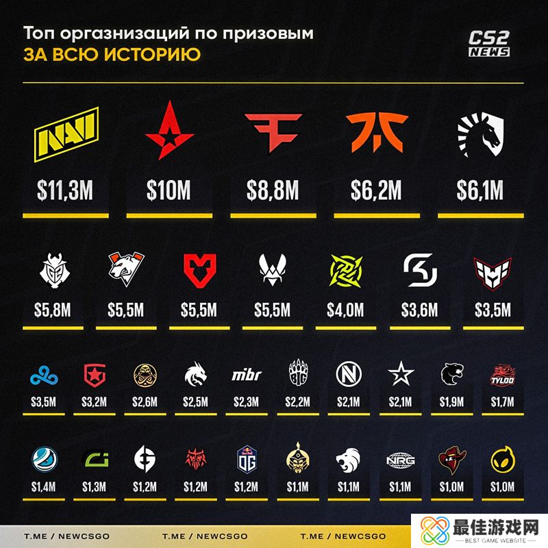 外媒统计了迄今为止在CS(包括CSGO和CS新版本)这个项目上获得百万美金奖金的队伍名单,其中