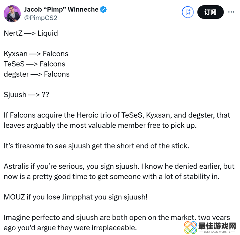 Astralis,如果你们是认真的,就签下sjuush。我知道他之前拒绝过你们,但现在是引入一名极具稳定性选手的绝佳时机。