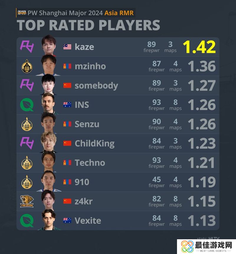 kaze在三张地图上打出了1 42的rating。随着FlyQuest拿到最后一个亚洲RMR出线名额,本次上海Major亚洲RMR也就此落下帷幕。而从赛后选手的rating数据看,前十名基本上被三支出