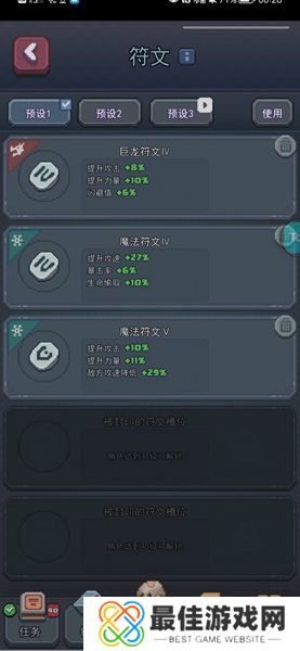4、符文配置:使用的是巨龙4和魔法45符文。主要考虑的是提升攻击力、力量、生命偷取以及攻速的增减等属性。在参考了其他高级玩家的搭配后,选择了双攻速减慢和双吸血等组合。由于心疼符文石,没有尝试其他搭配,但至少会带一个魔法4的吸血符文。