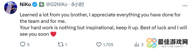 Nikola Kovač | NiKo在社交平台上回复了G2前队友们的告别动态。对Ilya Osipov | m0NESY:小孩,我对你只有满满的关爱。对Wiktor Wojtas | TaZ:兄弟,