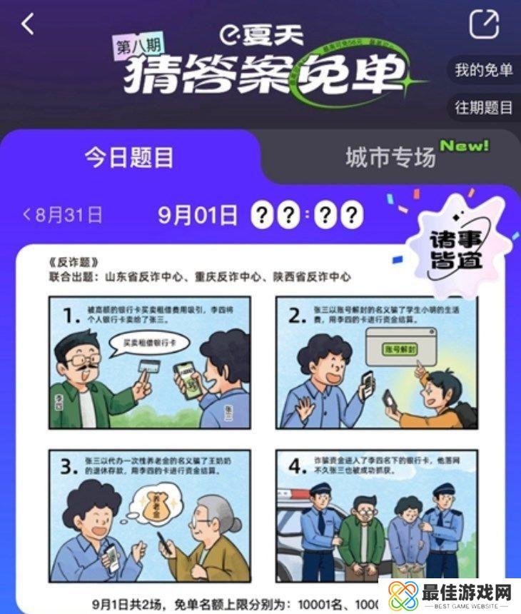 饿了么免单9 1答案是什么?具体的下单时间是多少?饿了么9月1日的免单题目是关于信息诈骗的,一共为大家带来了两场免单时间,下面跟着小编一起来看看饿了么免单9 1的具体时间吧。 饿了么免单9 1答案 免