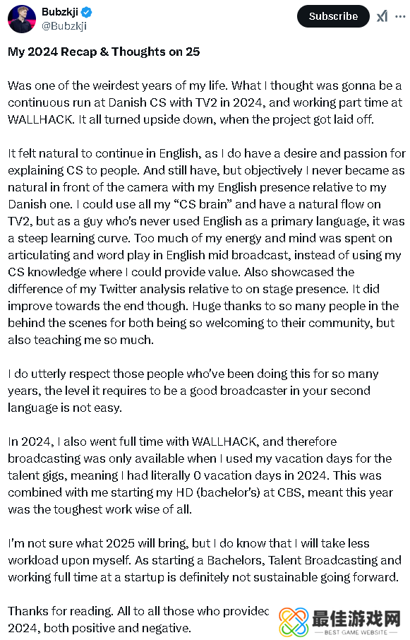 这是我人生中最奇怪的一年。我原以为2024年会继续在丹麦CS与TV2(Bubzkji此前工作的电视台)合作,并在WALLHACK(一家专注于电竞数据分析和战术优化的公司)兼职工作,但这一切在项目被裁员后彻底改变。