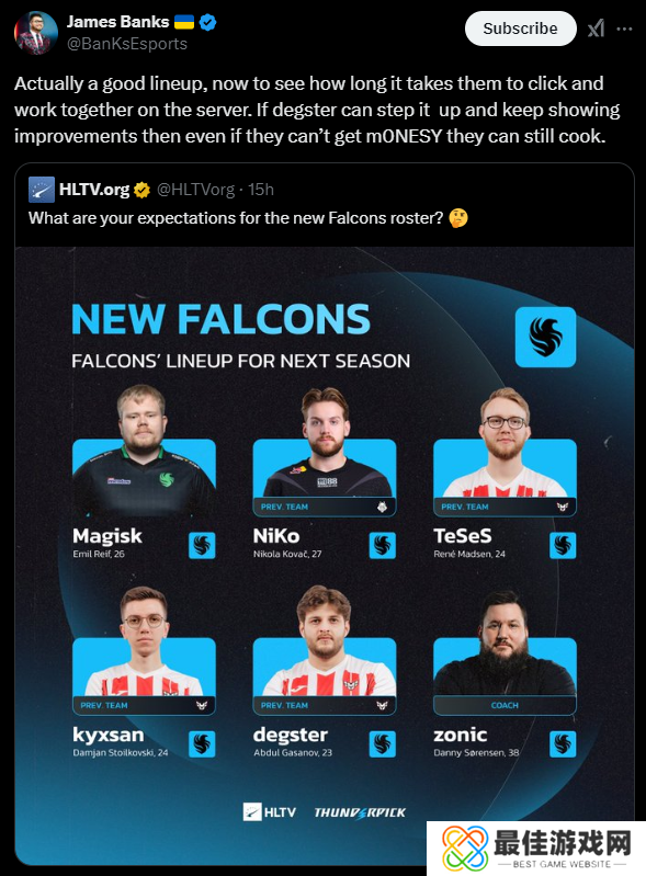 Falcons签下kyxsan、degster和TeSeS三名选手补全阵容后,知名解说BanKs在个人社交媒体账号上分享了自己对该阵容的看法。