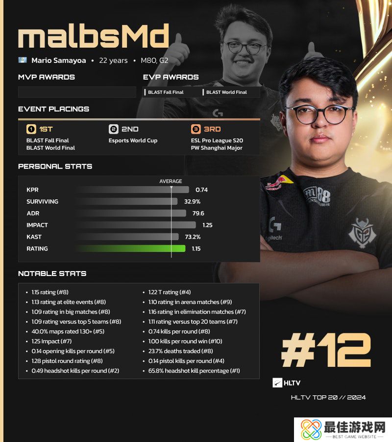 在2024年度HLTV TOP20榜单中,Mario Samayoa | malbsMd凭借下半年的精彩表现排名第12位。过往简介:在2024年度HLTV TOP20榜单中,malbsMd是近来北美地