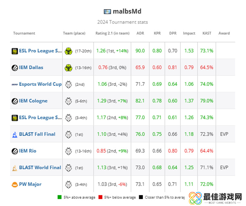malbsMd今年的Rating为1.15,是目前TOP20选手中并列第二高的选手,比许多排名在他之上的选手都要好,他在大型赛事(1.13,TOP9)和精英赛事(1.13,TOP8)中的Rating都保持在1.15,这要归功于他比大多数人都更经常带飞的能力(40%的地图Rating超过1.30,TOP5)。