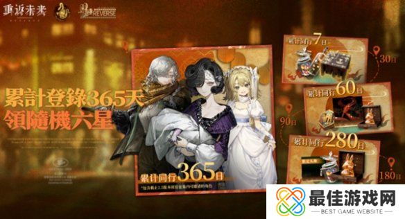 10、累计登录365天:秘闻邀请函×1(可随机邀请一名截止2.5版本常驻征集「于湖中央」中所有可以征集到的六星角色)、奇巧秘物匣子×3