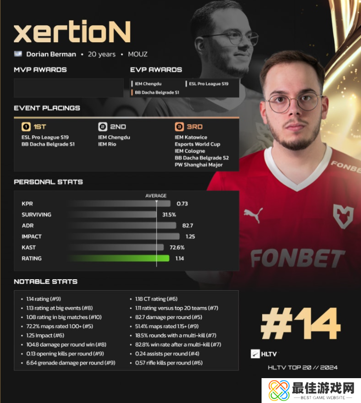 在2024年度TOP20选手中,xertioN完成了职业生涯的首次入选,并位列第十四位,这要归功于他全年,以及在队伍两次夺冠中的出色表现。过往简介:xertioN在20岁时首次登上HLTV年度TOP2