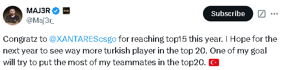 MAJ3R:祝贺XANTARES在今年入选TOP15。我希望明年能看到更多土耳其选手入选TOP20。我的目标之一是尽力让我的大部分队友入选TOP20。
