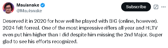 Mauisnake:2020年他在BIG的表现十分出色(尽管是线上比赛),当时也值得入选。2024年他的表现确实令人信服。他是全年最令人印象深刻的步枪手之一,尽管他缺席了下半年的Major,HLTV给他的排名仍然比我预测的要高。非常高兴看到他的努力得到了认可。