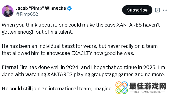 Pimp:如果你仔细想想,你会发现XANTARES并没有充分发挥他的天赋。多年来,他一直是个个人实力强大的选手,但从未真正加入过一个能够让他展示自己真正实力的团队。Eternal Fire在2024年表现出色,我希望他们在2025年能继续保持这种状态。我已经厌倦了看XANTARES参加小组赛,期待他有更多的突破。他仍然有机会加入国际队伍,想象一下