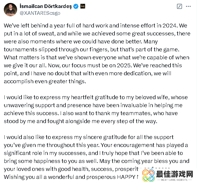 今天,2024年度最佳选手TOP15已出炉,土耳其选手XANTARES获此殊荣。在入选TOP15后,XANTARES在个人社交媒体上分享了自己获选的感受:我们已经告别了充满努力和艰辛的2024年。我们