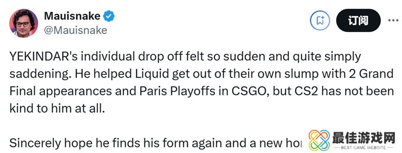 Mauisnake:YEKINDAR个人状态的下滑来得如此突然,实在令人惋惜。在CS:GO时期,他助力Liquid战队摆脱低谷,两次闯入总决赛,还打进巴黎Major淘汰赛,但CS新版本对他实在不太友好。