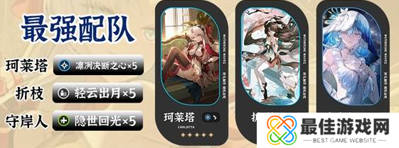 1、珂莱塔+折枝+守岸人:这是目前珂莱塔最强的配队之一。折枝的延奏技能可以为珂莱塔提供冷凝增伤和技能增伤,守岸人则作为辅助角色。