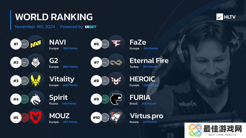 当我们对比HLTV所颁布的世界排名来看,情况则是有所不同。火力值强大的MOUZ取得的成绩明显不尽人意;而