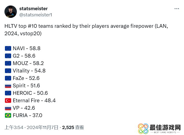 Natus Vincere以58.8的平均火力值登顶排行;榜眼则是刚刚拿下BLAST世界总决赛冠军的