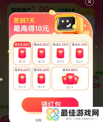 2、每日签到:只需完成每日签到就能获得对应的数额的红包奖励,累计签到7天最高可获得10元。